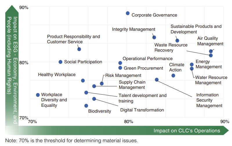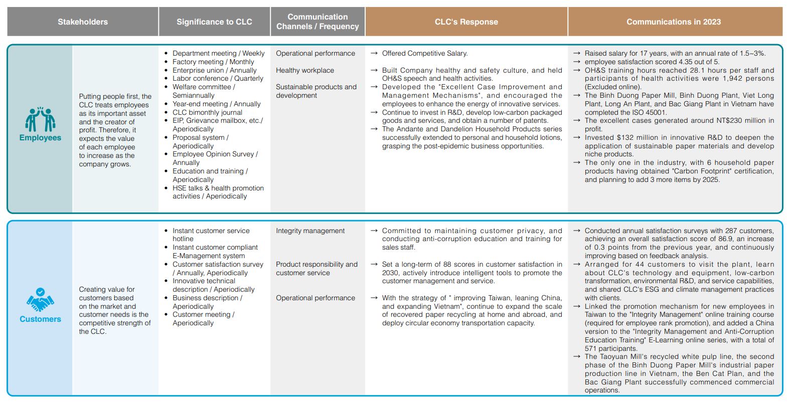 CLC references the AA1000SES Stakeholder Engagement Standard 2015, which includes 5 key principles. Based on these, we evaluate stakeholders and interviews several senior Corporate Sustainability Committee executives, including the Chairman, President, and senior management. Task force members also participate in identifying stakeholders by completing a questionnaire. Through this process, CLC identifies 6 key stakeholders affected by or interacting with its business operations: (1) employees, (2) customers, (3) shareholders/investors/financial institutions, (4) suppliers/contractors, (5) government/industry associations, and (6) society (media, local communities, non-profit organizations, academic institutions).