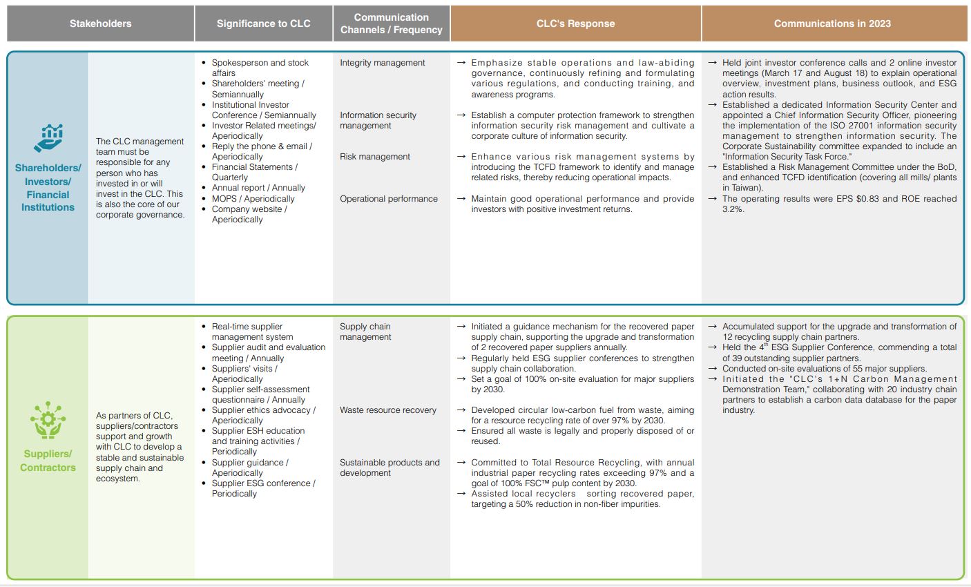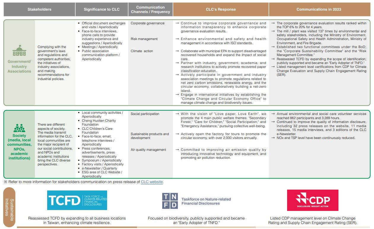 We believe that well communication with internal and external stakeholders is the prime mission of corporate accountability. Therefore, the Corporate Sustainability Committee holds the consensus meeting for sustainable development strategy and identifies stakeholders and material issues to provide important references disclosed in the sustainability report to meet all types of stakeholders' responses. In addition, we identified stakeholders and material issues from our senior management and Corporate Sustainability Committee. We collected responses from internal and external feedback on topics of concern to our ESG questionnaire every 3 years. The next one will be held in 2024.