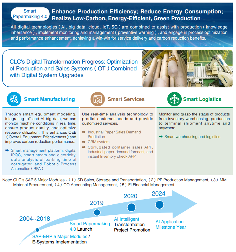 Leveraging the e-commerce boom and high demand for online shopping packaging, CLC collaborates with e-commerce customers to reduce packaging. CLC increases recovered paper use, improves structure and design for lighter, single-material packaging, uses water-based inks, and minimizes printing. Innovations include tape-free boxes, Design-in 3D platform, and sales forecasting system. AI data helps CLC meet market needs and reduce carbon footprints.