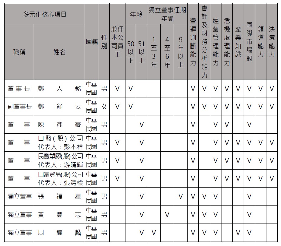 本公司於114年5月29日股東常會改選第19屆董事,董事會成員之多元化落實情形如下: