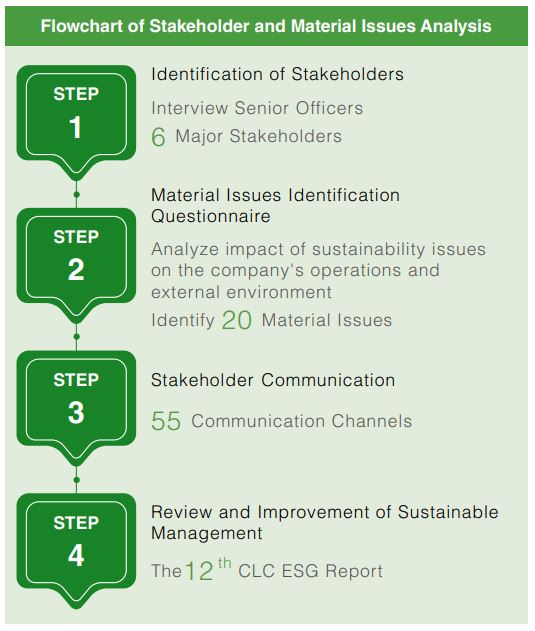 CLC references the AA1000SES Stakeholder Engagement Standard 2015, which includes 5 key principles. Based on these, we evaluate stakeholders and interviews several senior Corporate Sustainability Committee executives, including the Chairman, President, and senior management. Task force members also participate in identifying stakeholders by completing a questionnaire. Through this process, CLC identifies 6 key stakeholders affected by or interacting with its business operations: (1) employees, (2) customers, (3) shareholders/investors/financial institutions, (4) suppliers/contractors, (5) government/industry associations, and (6) society (media, local communities, non-profit organizations, academic institutions).
