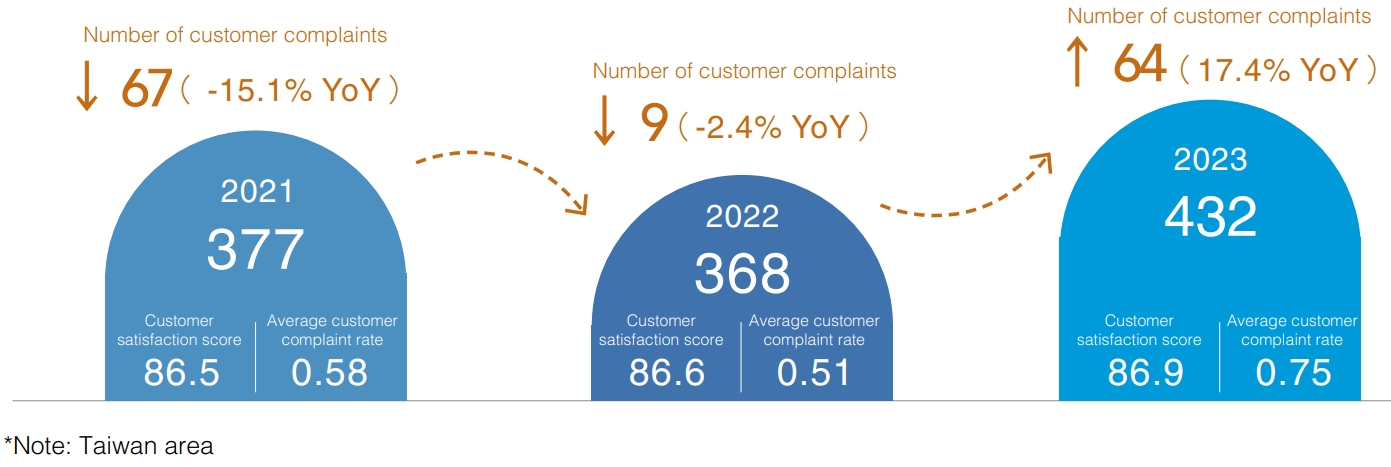 CLC conducts annual customer satisfaction surveys and has set a long-term goal of achieving a satisfaction score of 88 by 2030. To enhance customer service, improvements are made based on areas with lower satisfaction scores. In 2023, the customer satisfaction score was 86.9, an increase of 0.3 points, but it did not meet the annual target due to issues such as paper jam adhesive problems and poor sealing of household paper. We have assigned a task force to address these issues and has made practical improvements, ensuring that customer rights were not affected. In the future, we will continue to implement education and training, and introduce digitalization to enhance quality management in both production and service aspects.